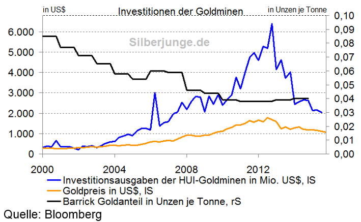 Die Förderkosten für Gold und Silber mit den Konsequenzen für InvestorenGerade zum Jahreswechsel 2015/16 nach der längsten Goldbaisse seit der Schließung des Goldfensters am 15. August 1971, dem Beginn eines "angeblich freien Marktes", sind viele Investoren höchst verunsichert. Genährt wird dies auch von den Berufsauguren. Ende 2015 sah die Deutsche Bank in ihrem "Commodity Outlook" vom 15. Dezember 2015 für das 4. Quartal 2016 einen Goldpreis von nur 980 US-Dollar. Die Societe Generale erwartete Gold 2016 bei 987, 2017 bei 950 und 2018 bei 900 US-Dollar. Goldman Sachs sah 1.000 US-Dollar Ende 2016. In der Wissensbox zum richtigen Timing bei Gold- und Silberkäufen zeigen wir, warum wir im Dezember 2015 gegen den weit verbreiteten Pessimismus anschrieben. Als andere Goldpreise von 900 US-Dollar oder sogar 500 US-Dollar in den Mund nahmen, zeigten wir uns sehr optimistisch. Dabei spielte neben dem Verhalten der Hedgefonds und anderer Großspekulanten am Terminmarkt auch die Betrachtung der Gewinnentwicklungen der großen Goldproduzenten eine bedeutende Rolle. Kennen Sie den HUI-Goldminenindex? Er enthält 15 große Goldminen, die rund ein Drittel der weltweiten Goldproduktion auf sich vereinigen. Der Börsenwert dieses HUI-Goldminenindex lag im Hoch am 8. September 2011 bei 268,9 Milliarden US-Dollar. Zum Vergleich erreichte der Marktwert von Apple ganz allein 775 Milliarden US-Dollar beim Kurshoch Ende April 2015. Netto-Gewinne der 15 großen Goldminen (HUI-Goldminenindex)Die 15 großen Goldminen des HUI-Goldminenindex wie beispielsweise Barrick Gold, Goldcorp, Newmont Mining und Randgold schmolz seit 2011 jedoch wie Schnee in der Sonne auf nur noch 50 Milliarden US-Dollar am 19. Januar 2016. Da wir damals für Gold sehr optimistisch waren, war dies für uns auch eine willkommene großartige Chance für Goldminen.