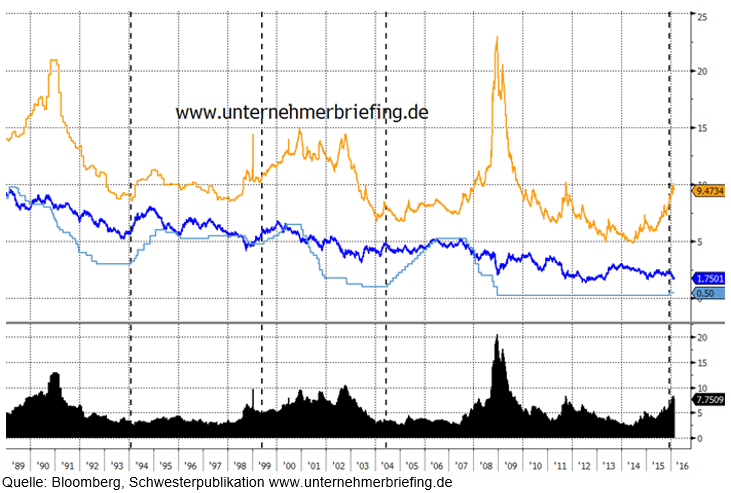 Der nebenstehende Chart zeigt die Entwicklung des US-Aktienindex S&P500 in Prozent seit 1942 um die Inflation bereinigt. Als die Geldentwertung auf 20 Prozent im Jahr 1947 zulegte, verlor der S&P500 bereinigt um die Preissteigerung deutlich. Als die US-Inflation Mitte 1970 6 Prozent erreichte, sahen wir die Duplizität der Ereignisse und der S&P500 verlor real wieder überdeutlich. 1974 sorgte dann der 1. Ölpreisschock für einen Anstieg der Inflation und einen gewaltigen Aktieneinbruch, was sich beim 2. Ölpreisschock dann abgeschwächt wiederholte. Merken wir uns: Inflationsschübe und Aktien sind anscheinend doch keine Freunde.Solange wir uns in einem inflationsfreien Umfeld bewegen, also die Geldspritzen der Notenbanken noch nicht für Inflationsschübe sorgen, kann das billige Geld die Aktienmärkte nach oben drücken. Wenn dann jedoch die Inflation kommt, werden Gold und Silber gewinnen und nicht Aktien. Dennoch gehören Aktien selbstverständlich zu einer Vermögensschutzstrategie. In unserer Sonderstudie "US-Imperium - Untergang ante portas" zeigen wir die Gewinnentwicklung der US-Unternehmen und erläutern, in welchen zeitlichen Abfolgen Rezessionen – also Einbrüche der Wirtschaft – zu sehen sind. Auch gehen wir darauf ein, wie schrumpfende Unternehmensgewinne dann Konjunkturabschwünge einleiten. Da die US-Unternehmen nach historischen Maßstäben nach Steuern Gewinne wie nie in Prozent der Wirtschaftsleistung des Landes einstrichen, war letztes Jahr Gefahr in Verzug. Vor Steuern lagen die Unternehmensgewinne in den USA im 3. Quartal 2015 bei 11,4 % nach 12,3 % im 3. Quartal 2014 und 12,6 % & im Hoch im 1. Quartal 2012. Warum wir im Dezember 2015 für Aktien skeptisch warenDie Risikoprämien für Unternehmensanleihen sind für uns ein wichtiger Signalgeber in puncto Rezessionsgefahr. Viele Unternehmen erweitern ihre Kapazitäten im Boom im Vertrauen auf seine Nachhaltigkeit. Die Verschuldung nimmt zu, um die Investitionen stemmen zu können. Finanzierungsmittel können über Bankkredite oder über die Begebung von Unternehmensanleihen am Kapitalmarkt beschafft werden.
